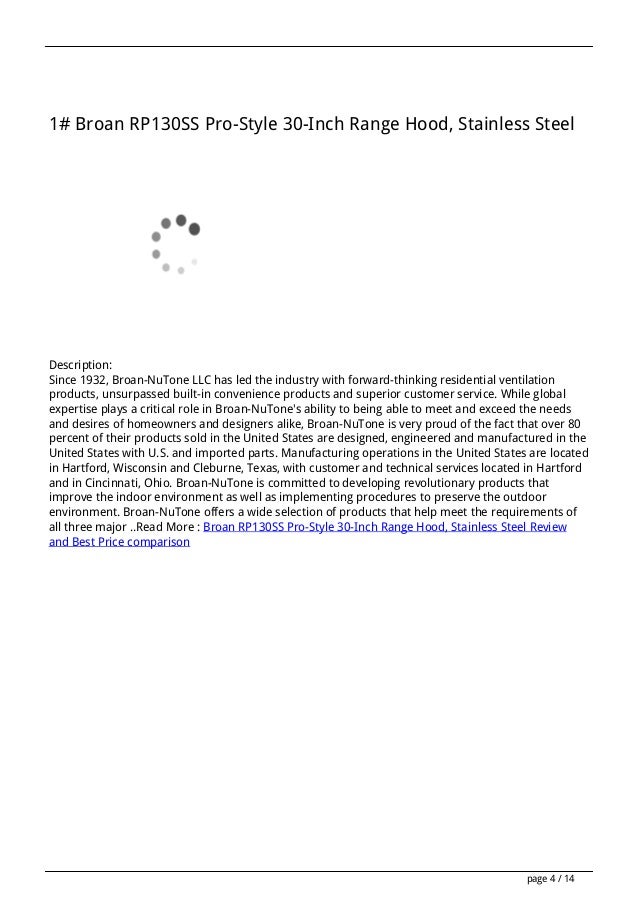 Broan RP130SS Pro-Style Under-Cabinet Range Hood, 30-Inch, Stainless Steel The RP1 series is part of Broan’s newest pro-style under cabinet hood collection, uniting stylish appearance with tremendous value. ... Retrieve Content