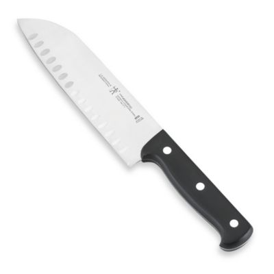 Combining the benefits of a chef's knife and cleaver, this hollow-ground santoku is indispensable for chopping, slicing and dicing. Oval indentations on the blade's sides reduce friction to produce clean, uniform cuts and minimize sticking. ... View Document